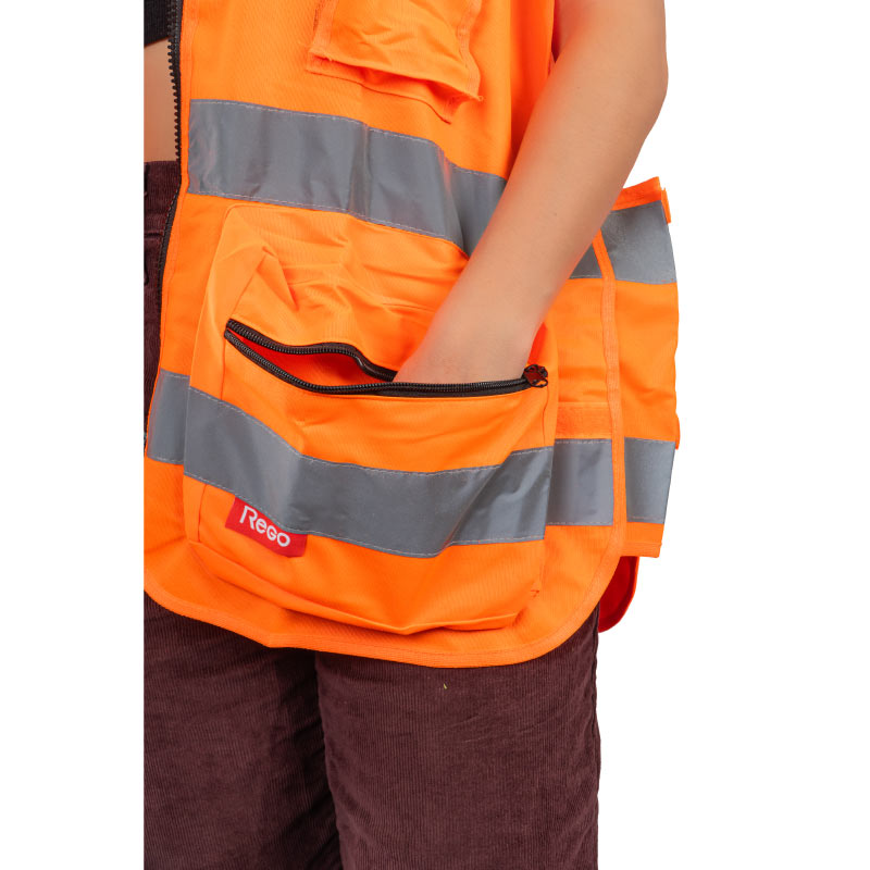 Chaleco Reflectivo Multibolsillos Ajustable. Cierre delantero con cremallera. Con 5 bolsillos delanteros, dos de ellos con cierres de cremallera.