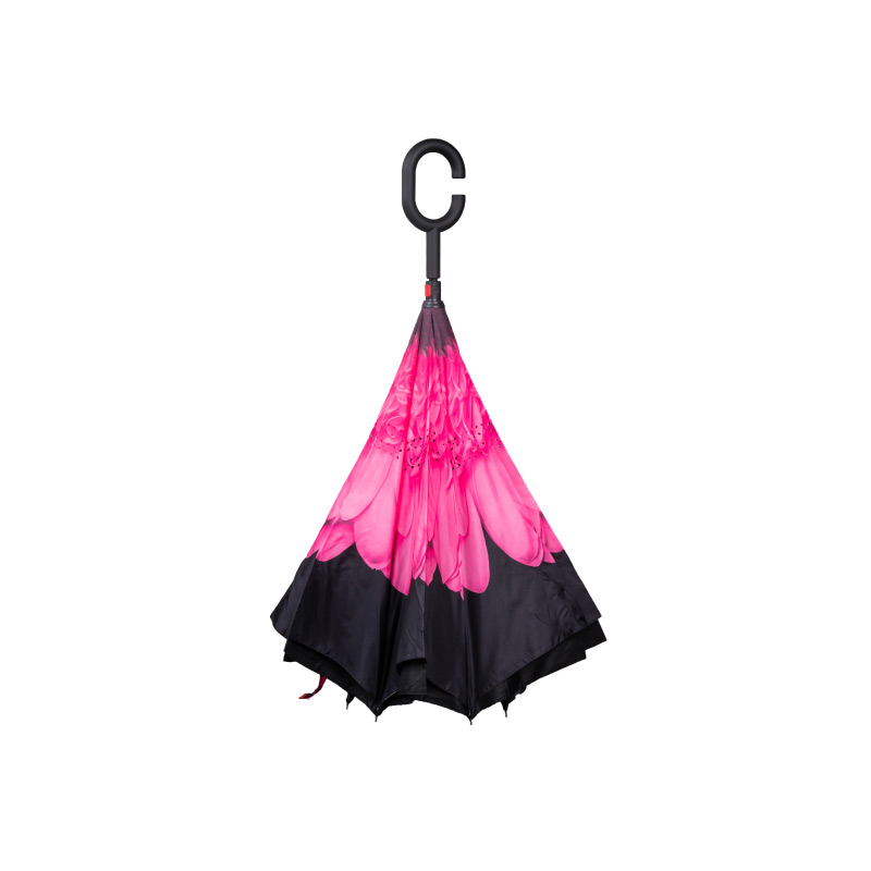 Paraguas deluxe, mecanismo semi-automático, puño de plástico tipo mano libre C, variedad estampados, 82 cms de largo cerrado, carpa de 23pulgadas. Se convierte en un cono que recoge el agua evitando así dejar mojado el piso, y el interior de tu auto.